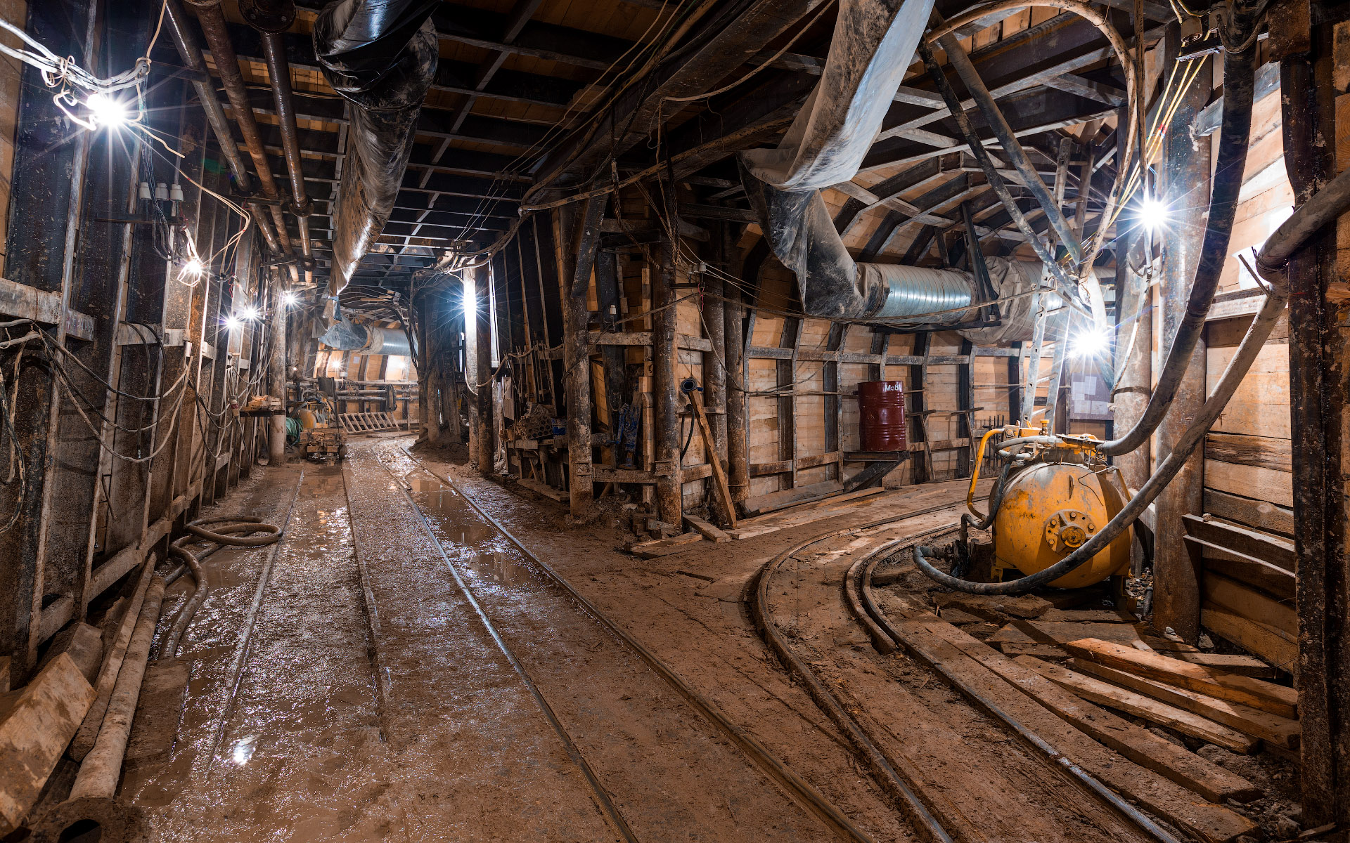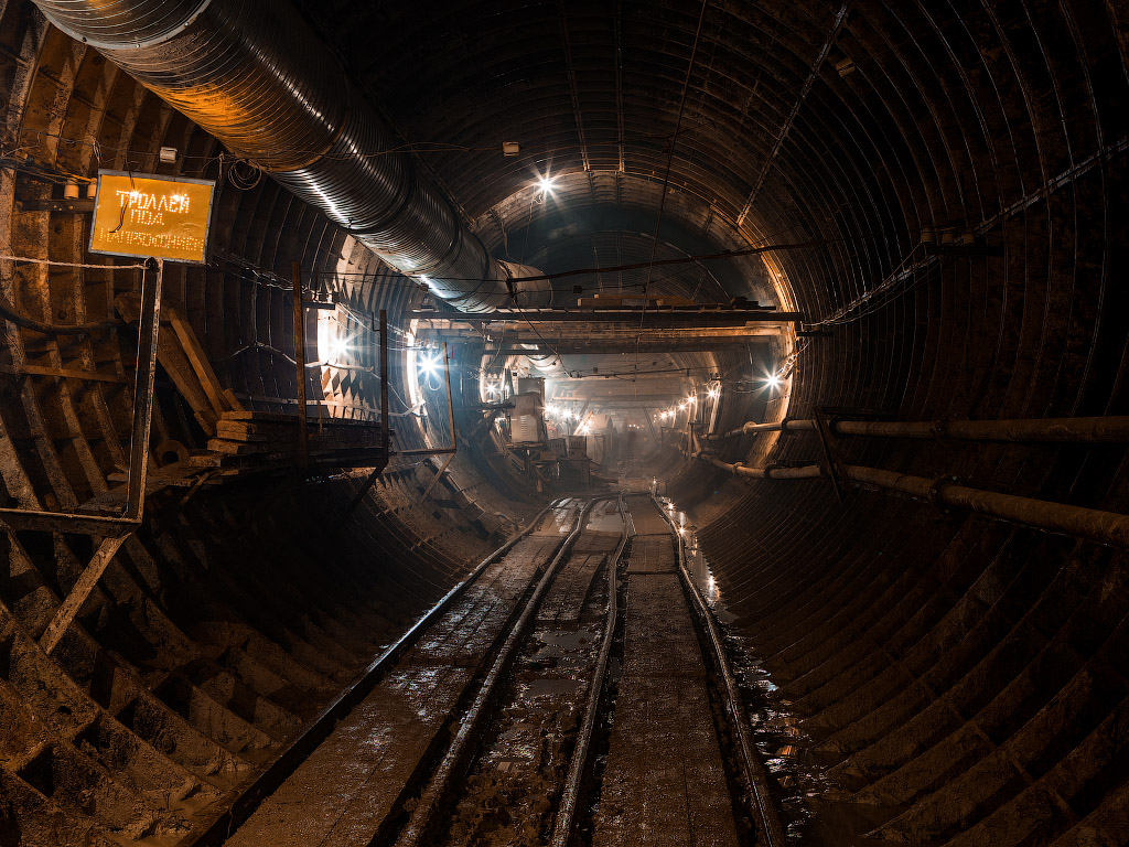 13. Крест подходной выработки. Тут можно увидеть торец левого станционного тоннеля, начало штольни к среднему залу. Далее еще находится крест с правым станционным тоннелем и в продолжении штольни — кабельно-вентиляционный коллектор.