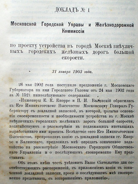 «Инженеры Е. К. Кнорре и П. И. Балинский обратились к Его Императорскому Высочеству Московскому Генерал Губернатору с докладной запиской, в которой пологая основание своевременности и необходимости устройства в г. Москве внеуличных городских железных дорог большой скорости, ходатайствуют о рассмотрении в надлежащих инстанциях выработанного ими проекта. Вследствии чего Его Императорское Высочество, препроводив копию с докладной записки гг. Кнорре и Балинского, предложил мне передать означенное ходатайство на рассмотрение Московского Городского Общественного Управления и о последующем своевременно Ему представить.