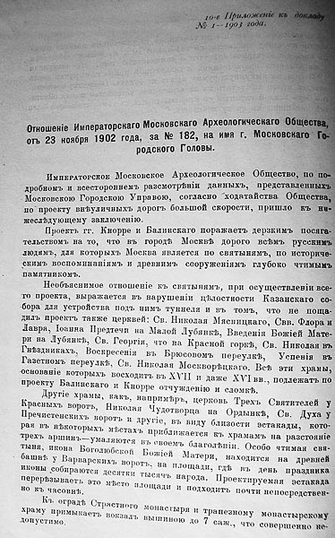 Императорское Московское Археологическое Общество, по подробном и всестороннем, рассмотрении данных, представленных Московскою Городскою Управою, согласно ходатайства Общества, по проекту внеуличных дорог большой скорости, пришло к нижеследующему заключению.