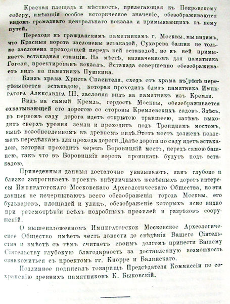 Приведенные данные достаточно указывают как глубоко и близко затрагивает проект внеуличных железных дорог интересы Императорского Московского Археологического общества, но эти данные не исчерпывают всего обезображения города Москвы, его бульваров, площадей и улиц, обезображение которых ясно видно при рассмотрении всех подробных профилей и разрезов сооружений.